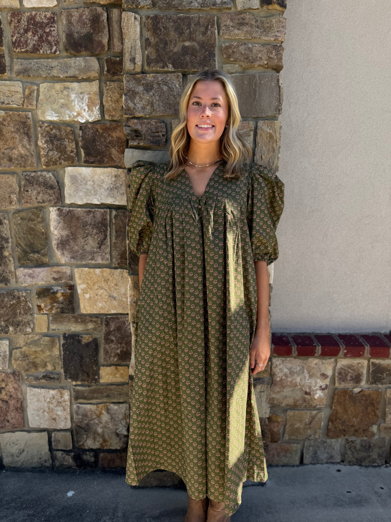 Vintage charm meets easy elegance. This dress features a soft A-line silhouette with dramatic puff sleeves, a deep V-neckline, and delicate mini floral print throughout.