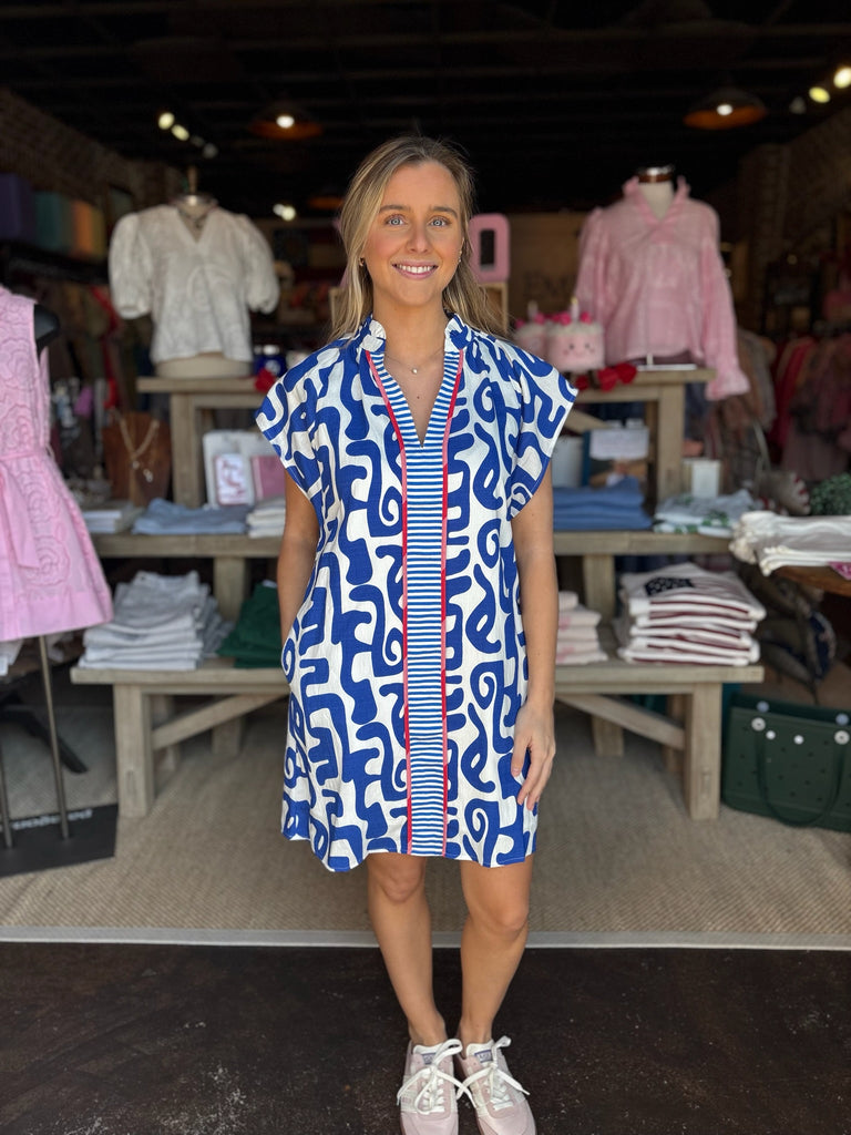 Elevate your everyday wardrobe with the Mila Patterned Dress in Blue—a versatile piece that seamlessly transitions from office to evening. The eye-catching pattern adds visual interest while the rich blue tone complements any complexion and pairs effortlessly with your existing pieces. Crafted for comfort and style, this dress flatters multiple body types and works for countless occasions. Whether you're heading to work, brunch, or a night out, the Mila delivers polished sophistication without the fuss. A timeless investment that works harder than it looks.
