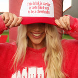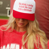 This white and red trucker hat features a popular graphic inspired by the beloved koozie design. Perfect for anyone who once cheered from the sidelines, it’s a fun, playful way to show off that cheerleader spirit with a laid-back, cool vibe.
