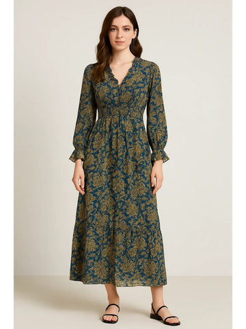 Navy Pintuck Scallop Trim Long Sleeve Top