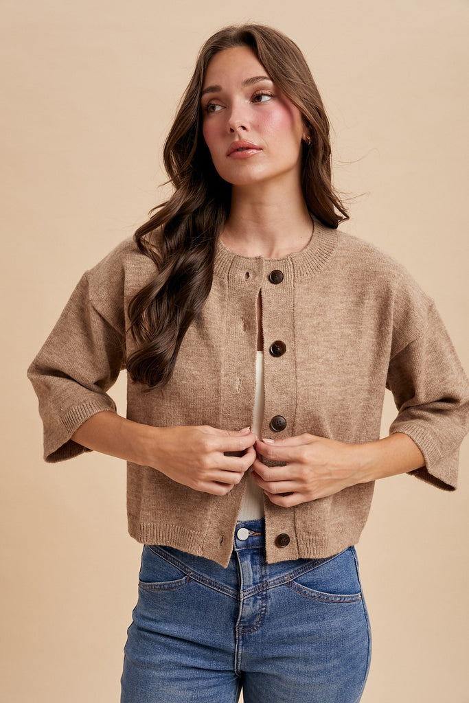 Layer up with effortless style in this half sleeve knit cardigan! Crafted from soft, lightweight fabric, it's the perfect piece for transitional weather or layering over your favorite tee. The classic round crew neckline and button-down front give you easy styling options, whether you're dressing it up or keeping it casual. Cozy comfort meets versatile charm.