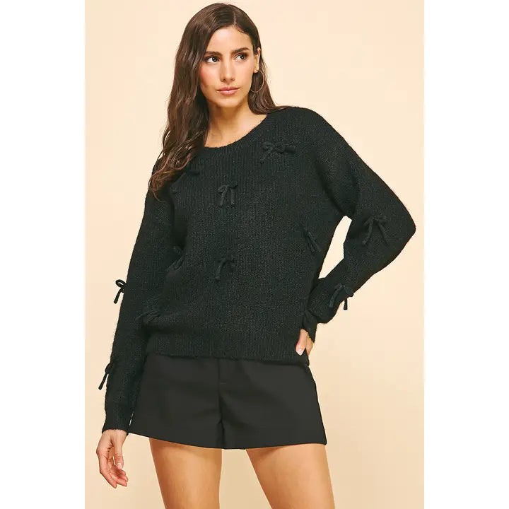 Wrap yourself in cozy elegance with this black ribbon sweater that's as charming as it is comfortable. Soft fabric hugs you just right, while delicate bow details add a touch of whimsy to your everyday look. True to size, it's the perfect piece for layering or wearing solo. Whether you're heading to brunch or settling in for a relaxed weekend, this sweater delivers style without the fuss.