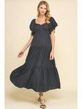 Effortlessly chic meets fun in this navy maxi dress that's ready for anything. The classic collar and V-neckline create a polished look, while cap sleeves add a touch of sweetness. Tiered layers bring movement and dimension to the silhouette, and the self-tie waist lets you cinch it just right for your perfect fit. Dress it up or down—this versatile piece is your new go-to for looking put-together without trying too hard.