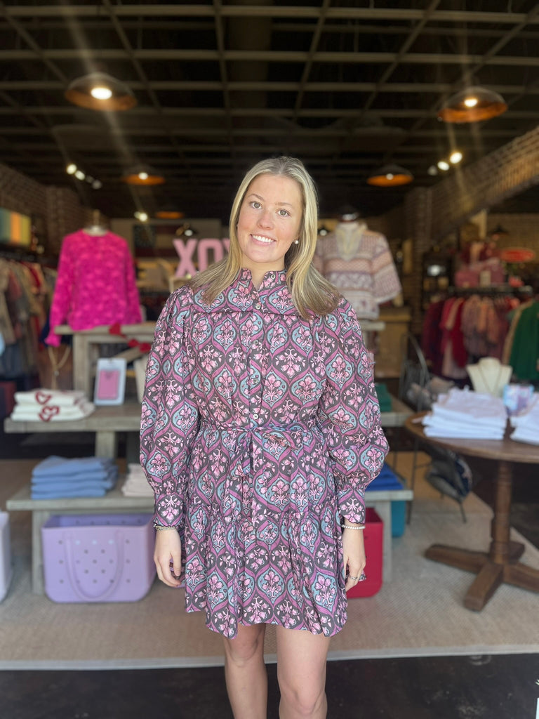 Elevate your everyday style with this charming plum multi mini dress that's equal parts sophisticated and fun. Featuring a crisp China collar and button-down front, it's designed for effortless elegance. The self-tie waist cinches your silhouette while delicate ruffled detailing and precise stitching at the hemline add personality and movement. Perfect for brunch dates, casual outings, or whenever you want to feel put-together without trying too hard.