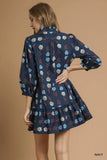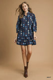 Bloom into effortless style with this charming tiered mini dress! Featuring a vibrant multicolor floral print against a navy backdrop, it's designed to turn heads. The split neckline with tie detail adds a flirty touch, while long sleeves with elastic cuffs keep things polished. Ruffled tiered layers create movement and dimension, perfect for twirling through your day. Fully lined for comfort and confidence. A playful wardrobe essential that brings personality to any occasion.