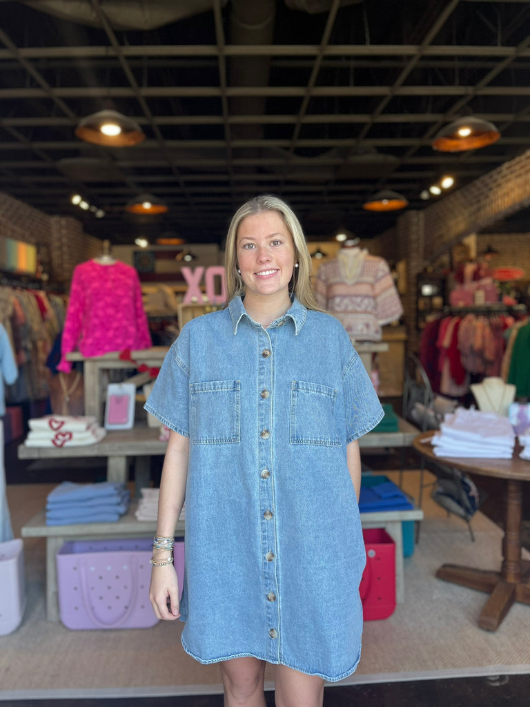 Throw on this denim button-up shirt dress and instantly level up your casual game. The classic blue denim pairs perfectly with sneakers for a laid-back vibe or dress it up with boots and accessories for something more polished. With a timeless button-front design and mini length, it's the kind of piece that works overtime in your wardrobe—wear it solo or layer it over your favorite tee. Effortless style that actually feels as good as it looks.