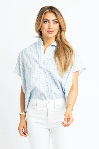 Blue Floral Stripe V-Neck Collar Top