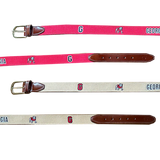 Peach State Pride UGA Embroidered Belts are proudly 100% made in the U.S.A. and officially licensed by The University of Georgia. Each belt showcases the iconic UGA Standing Dawg, Block G, and "Georgia" designs. Crafted from high-quality leather and available in khaki and red, these belts also feature an embossed PSP logo, a brass buckle, and a stylish seersucker lining.