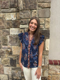 Elevate your style with the Navy Campbell Top, featuring delicate ruffle sleeves that add a touch of feminine charm. The navy floral design offers a timeless, versatile look perfect for both casual outings and dressier occasions. Lightweight and comfortable, this top blends effortless elegance with everyday wearability.
