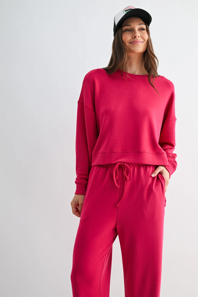 Meet your new favorite sweatshirt. Designed with a boxy-fit waistband for ultimate comfort, this sweatshirt feels as soft as butter and as light as a feather. The dropped shoulder design adds a touch of relaxed sophistication, making it perfect to pair with your favorite scuba pants or shorts. Elevate your casual wardrobe with this versatile piece that effortlessly combines style and coziness. Whether you're lounging at home or stepping out, this sweatshirt will be your go-to for a look that's put together yet undeniably comfortable.