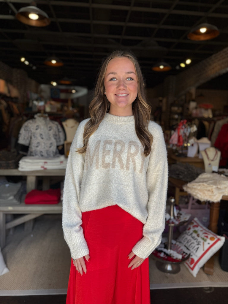 Shimmering metallic yarns elevate this cozy knit with a subtle holiday glow. The "Merry" intarsia detail makes it festive yet wearable beyond the season.