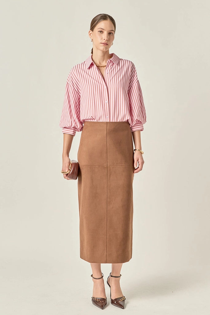 This Striped Balloon Sleeve Shirt offers an easy, polished look with its lightweight feel and relaxed silhouette. Designed with soft pink and red stripes and finished with subtle balloon sleeves, it brings a fresh update to a classic button-down. The versatile shape makes it effortless to style for work, weekends, or anything in between, giving you a piece that feels comfortable while still looking refined