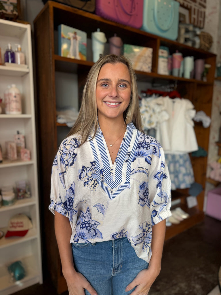 Elevate your warm-weather wardrobe with the Alexandra Top, a charming short-sleeve floral design that effortlessly transitions from casual days to evening outings. The crisp white and blue palette offers versatile styling options, pairing beautifully with denim, linen pants, or skirts. Crafted for comfort and movement, this piece brings a fresh, feminine touch to any occasion while remaining a timeless staple you'll reach for season after season.