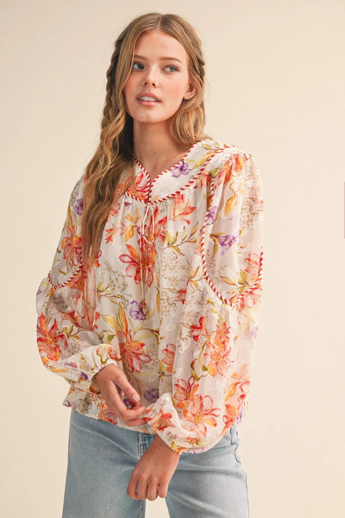 Elevate your everyday style with this charming floral balloon sleeve top that's equal parts romantic and fun. The notched V neckline features a delicate tying detail, while contrast rope trim adorns the yoke and sheer long sleeves for an unexpected twist. Elastic cuffs keep the billowy silhouette perfectly in place, and the lined construction ensures comfortable, confident wear. A playful piece that transitions seamlessly from brunch to evening plans.