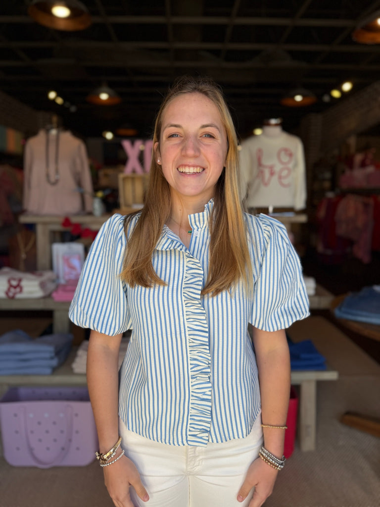 Elevate your everyday style with this charming striped button-up top that's equal parts fun and flattering. The high ruffled neckline and ruffle-trimmed placket add a playful touch, while the relaxed silhouette keeps things comfortable and effortless. Short bubble sleeves complete the look with a modern twist. Perfect for casual outings or dressing up with your favorite bottoms—this piece brings personality to any wardrobe.