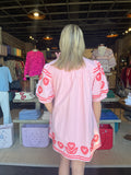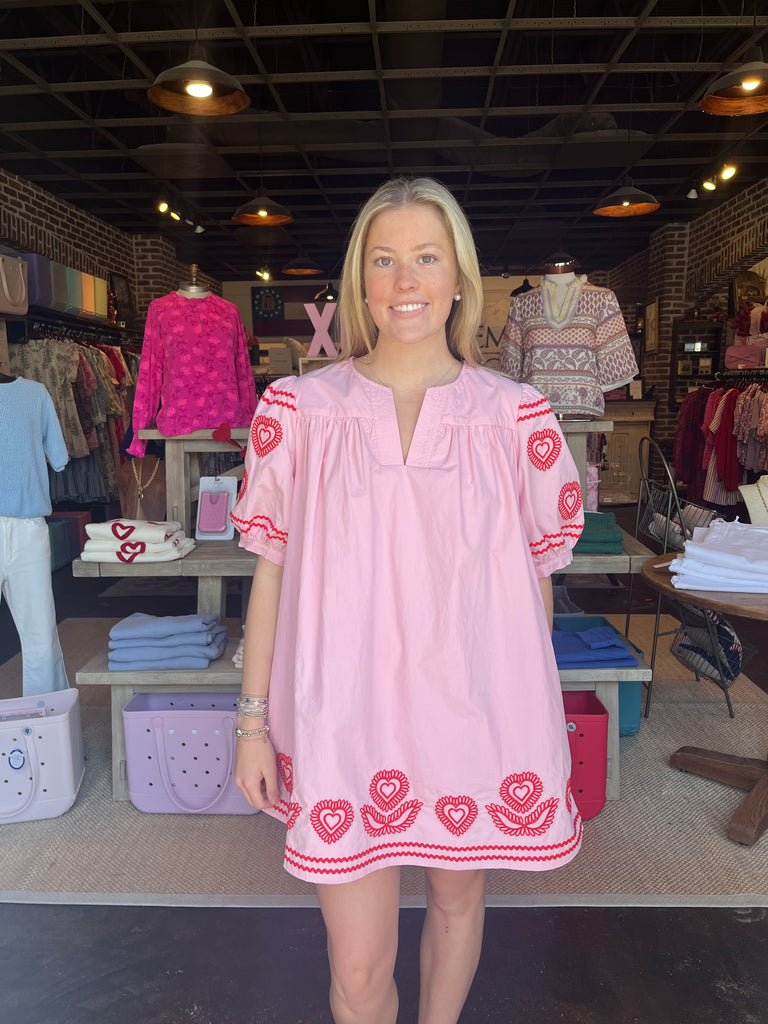 Strut & Bolt's Heart Embroidery Mini Dress is pure romance with a playful twist. Crafted from soft cotton poplin, this relaxed babydoll silhouette features a flirty split V neckline and charming puff sleeves with banded cuffs. Shirred shoulders and yoke create effortless movement, while statement heart floral embroidery adds personality throughout. Practical side pockets and a lined interior complete this sweet-meets-sassy piece. Perfect for date nights, brunch, or whenever you want to wear your heart on your sleeve—literally.