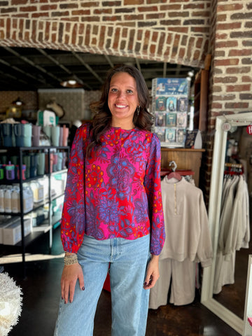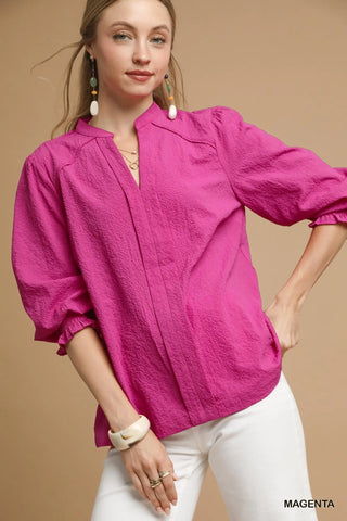 Red Pintuck Check Textured Puff Sleeve Blouse