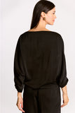 This top features a relaxed dolman sleeve silhouette and a boat neckline for a refined, modern look. The silky finish adds a touch of glam, perfect for dressing up or down.