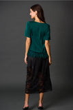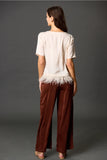 Crafted from smooth, lustrous satin, this top features a relaxed fit and short sleeves trimmed with soft, airy feathers for a touch of drama.