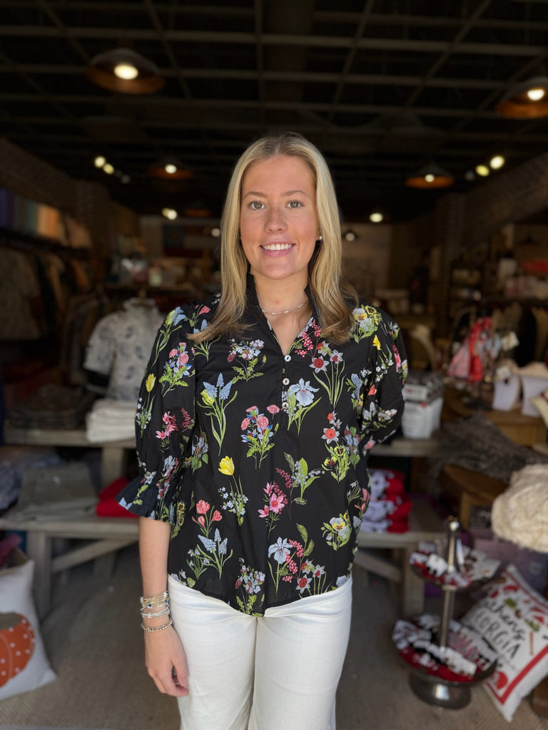 The Karli Top brings a playful pop of color to your everyday wardrobe. This striking black base serves as the perfect canvas for vibrant floral patterns that dance across the fabric, creating an eye-catching look that works equally well for casual outings or dressed-up occasions. Comfortable and versatile, it's the kind of piece that instantly elevates any outfit with personality and charm.