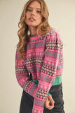 Cozy up in this charming fair isle cropped sweater that's equal parts retro and right-now. The all-over geometric knit pattern brings instant visual interest, while gathered puff shoulders add a playful twist to the classic silhouette. Ribbed detailing at the round neck, cuffs, and hem keeps everything polished and put-together. The semi-cropped length hits just right for pairing with high-waisted bottoms. Perfect for layering or wearing solo when you want to make a statement without saying a word.