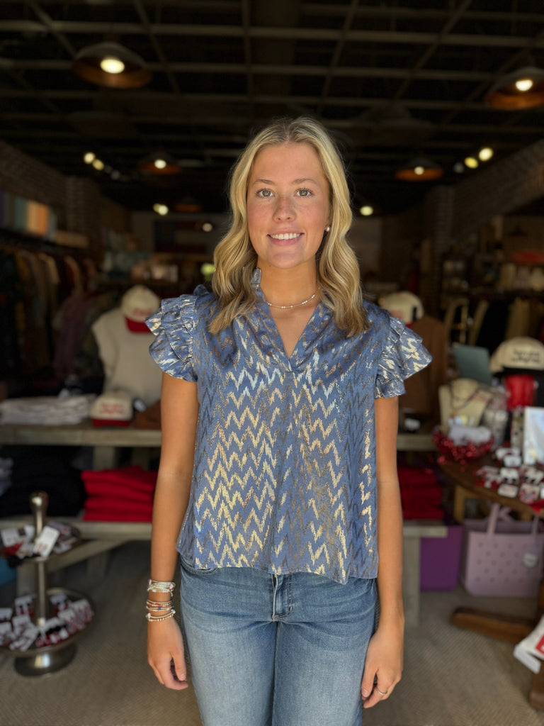 Add a splash of sparkle to your wardrobe with this blue and gold metallic chevron top. Its shimmering pattern catches the light playfully, perfect for standing out at any gathering. Comfortable yet eye-catching, this top brings a fun twist to your look whether you're dressing up or keeping it casual. Let your style shine with bold colors and a lively chevron design!