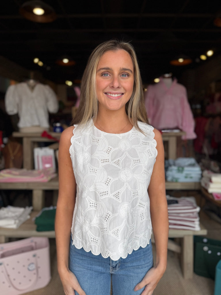 Effortless elegance meets playful charm in this White Eyelet Cotton Scallop Top. Crafted from delicate floral cotton eyelet, this sleeveless tank features a romantic round neckline and signature scalloped edges along the hem and shoulders for a feminine touch. The lined bodice ensures comfort and coverage, while the back keyhole with button closure adds a chic detail. Perfect for warm-weather styling, whether you're dressing it up for brunch or keeping it casual with your favorite denim.