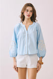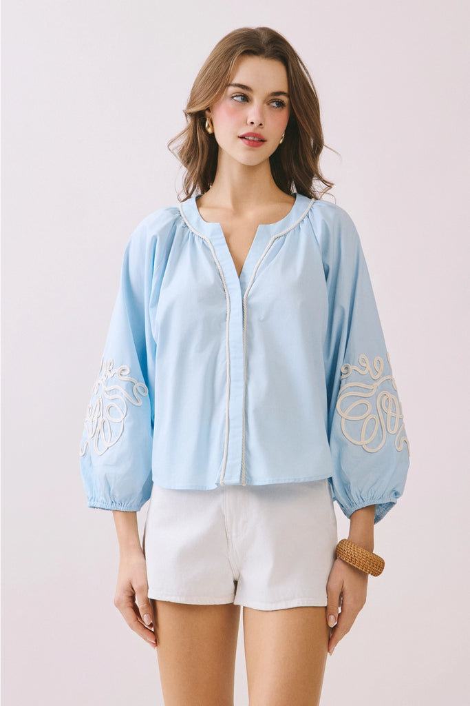 Make a statement with the Cassidy Top in Baby Blue, featuring dramatic 3/4 puff sleeves that command attention. Bold embroidery adorns the front, while a flattering split neckline and contrasting trim along the placket and collar add sophisticated detail. The voluminous silhouette creates effortless movement and dimension, perfect for elevating your everyday look or dressing up for special occasions. A versatile piece that transitions seamlessly from day to night.