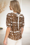Charming and feminine, this brown puff sleeve blouse is detailed with ivory floral embroidery and a sweet back tie closure. A versatile boutique favorite that’s perfect for day-to-night and fall winter seasonal collections.