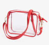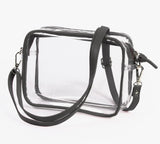 *crafted of clear vinyl and soft vegan leather, featuring brass hardware accents