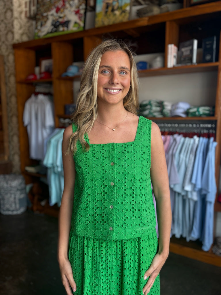 Effortless spring style starts here. This green eyelet tank features delicate cutout details and a flattering silhouette perfect for warm weather. The breathable fabric keeps you cool while the refined design works beautifully on its own or layered under lightweight pieces. Pair it with our matching Daisy skirt for a coordinated, garden-fresh look that transitions seamlessly from day to evening.