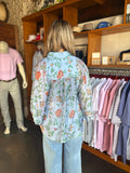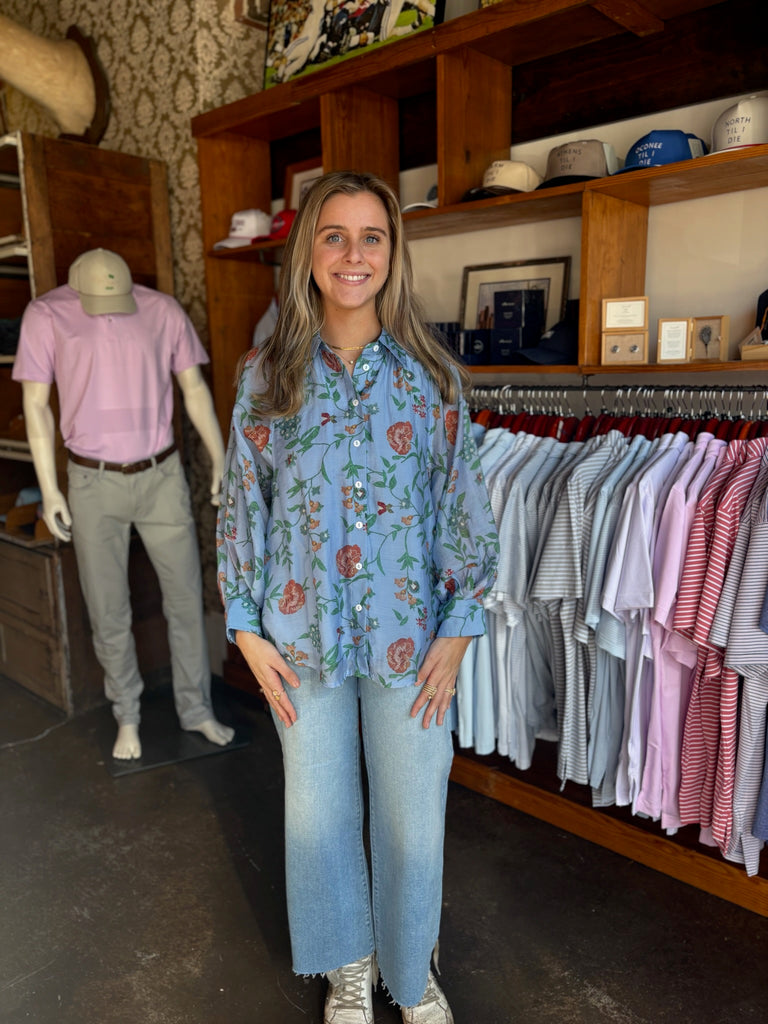 Elevate your wardrobe with the Natalie Top, a stunning piece featuring a captivating blue floral design that brings effortless elegance to any occasion. The intricate botanical pattern adds visual interest and versatility, making it perfect for pairing with your favorite jeans, skirts, or trousers. Crafted for comfort and style, this top transitions seamlessly from casual daytime wear to evening outings. Whether you're dressing up for a special event or keeping it relaxed on the weekend, the Natalie Top delivers timeless appeal with a modern twist that flatters and inspires confidence.