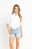 White Solid Ruffle Neck Poplin Puff Sleeve Top