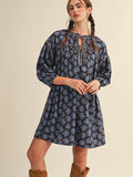 Brighten your wardrobe with this playful Contrast Floral Mini Shift Dress. Featuring a ruffled neckline with a chic notched V and a double tying closure in contrast striped binding, it adds a charming twist to classic florals. The 3/4 long puff sleeves with elastic cuffs and matching striped binding bring delightful detail, while the raglan seam ensures a comfortable fit. Designed with a shift silhouette, it’s fully lined for ease and includes handy pockets for a touch of practicality. Perfect for sunny days and spontaneous adventures.