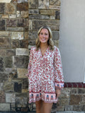 This fun and colorful Flame Scarlet Long Sleeve Mini Dress features playful florals that make it perfect for any concert or night out. Its mini length and vibrant design are sure to turn heads, and it can easily be paired with your favorite pair of boots. Don't miss out on this must-have addition to your wardrobe.