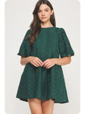 Pintuck puff short sleeve mini dress in checkered textured woven fabric. This babydoll mini dress features puff short sleeves, pin-tuck detail at front, elastic smocking at back waist, shirred shoulders, a relaxed fit, side pockets, round neck, and lining.