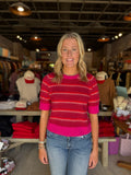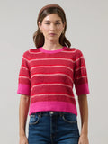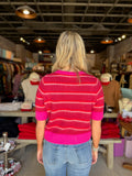 Add a pop of fun to your wardrobe with this striped color block sweater. With its vibrant pattern, short sleeves, and flattering cropped fit. The soft texture keeps things comfy while the bold design turns heads. Style it with high-rise jeans, white sneakers, and a mini backpack for a fresh, playful look.