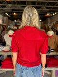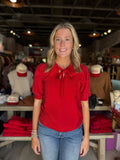 Shine with effortless elegance in this party-perfect top. Designed with a shimmery finish, it features a bow neck tie, pleated shoulders, and chic half-length sleeves. Style it with faux leather pants and finish the look with sleek boots or open-toe block heels.