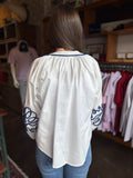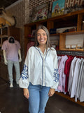 Elevate your wardrobe with the Cassidy Top, a white long sleeve blouse featuring elegant navy blue embroidery. Its refined detailing adds a subtle yet striking contrast, perfect for both professional settings and casual outings. Crafted to offer a flattering fit, this blouse blends classic style with a touch of artistry, making it an essential piece for versatile, polished looks.